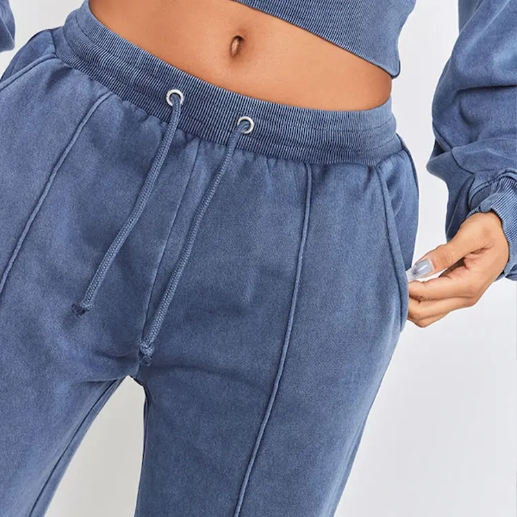 Huili Manufacturer Custom Logo Crop Tracksuits Blank Pullover Hooded Top Acid Wash Activewear Women Sweatpants and Hoodie Set